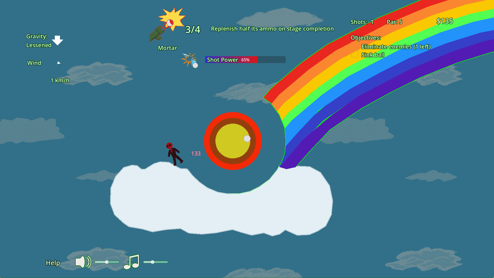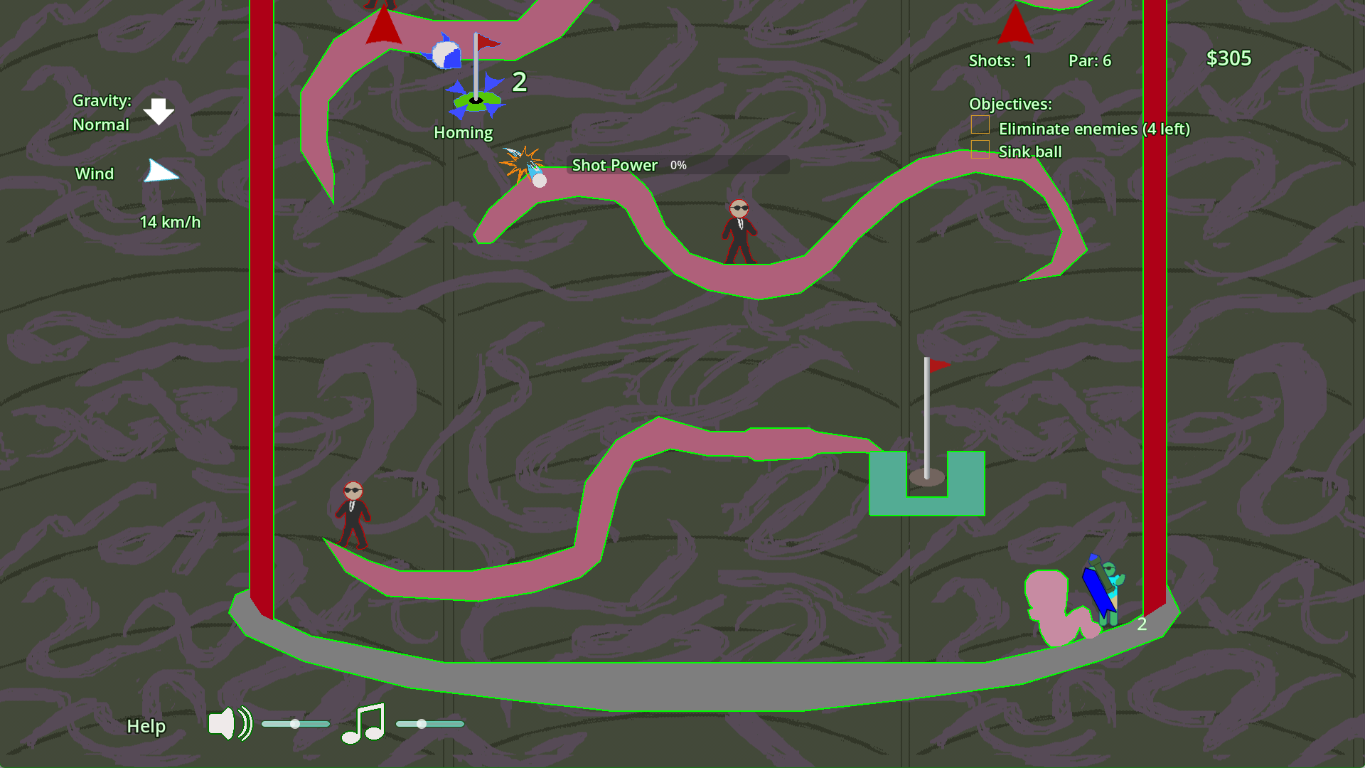 A golf/artillery game made in one week for Brackeys Game Jam 2026.1 (with the theme of Strange Places). Use your golf club and weapons to sink the ball and eliminate all enemies in as few shots as possible! Performing well earns more money, which can be used to buy upgrades.